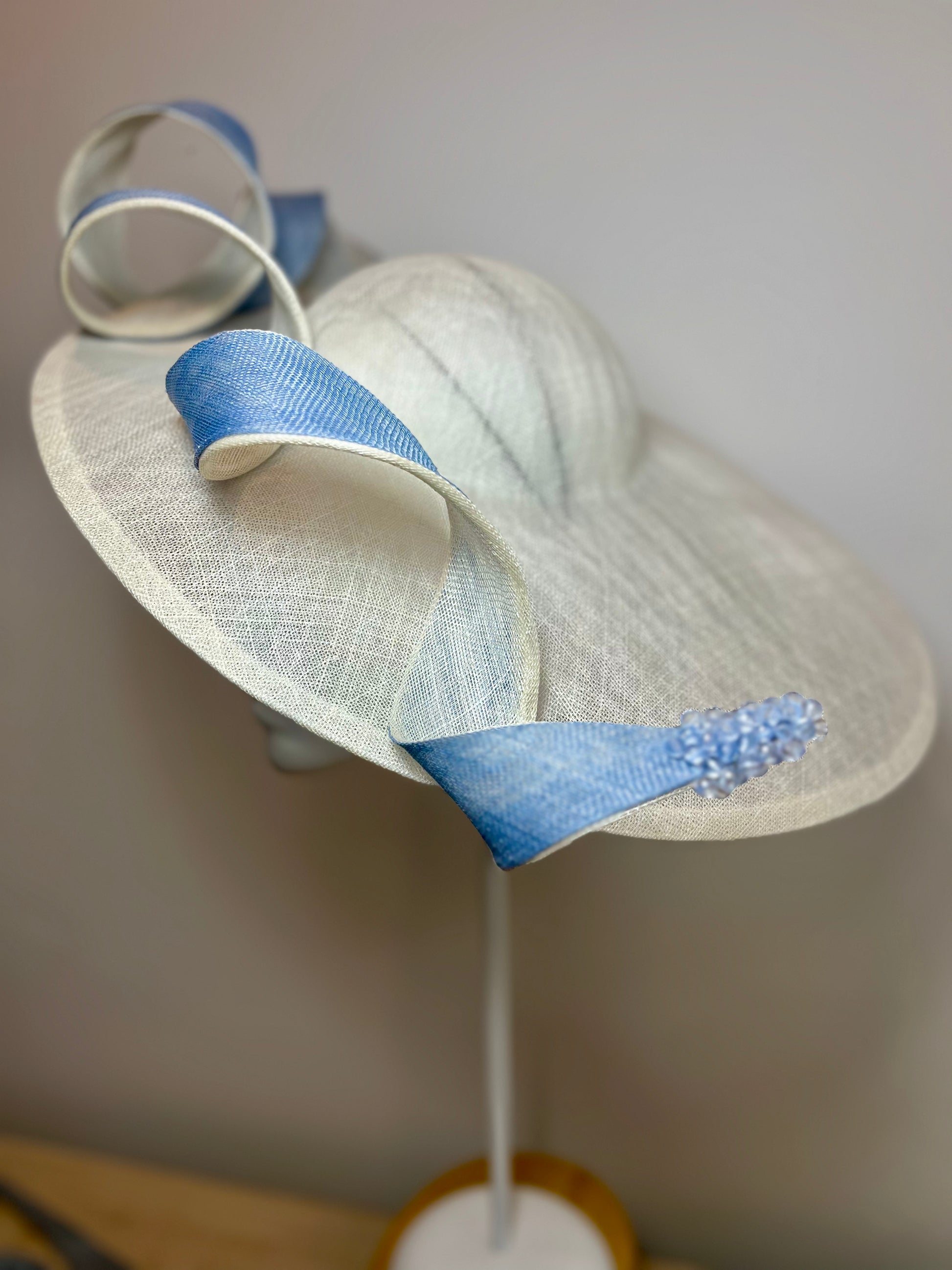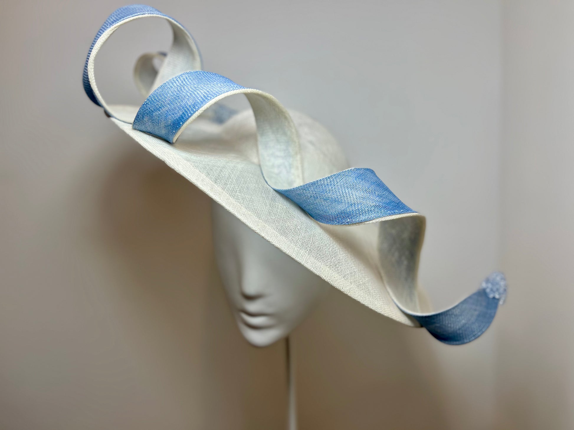 Elevate your look with this striking wide-brim hat, a modern statement piece designed for elegance and artistry. Crafted from a soft ivory base, the hat is adorned with a sculptural ribbon in a gentle gradient of sky blue, curling gracefully across the brim like ocean waves in motion. The sweeping design adds both movement and sophistication, while the airy sinamay material keeps the piece lightweight and refined.