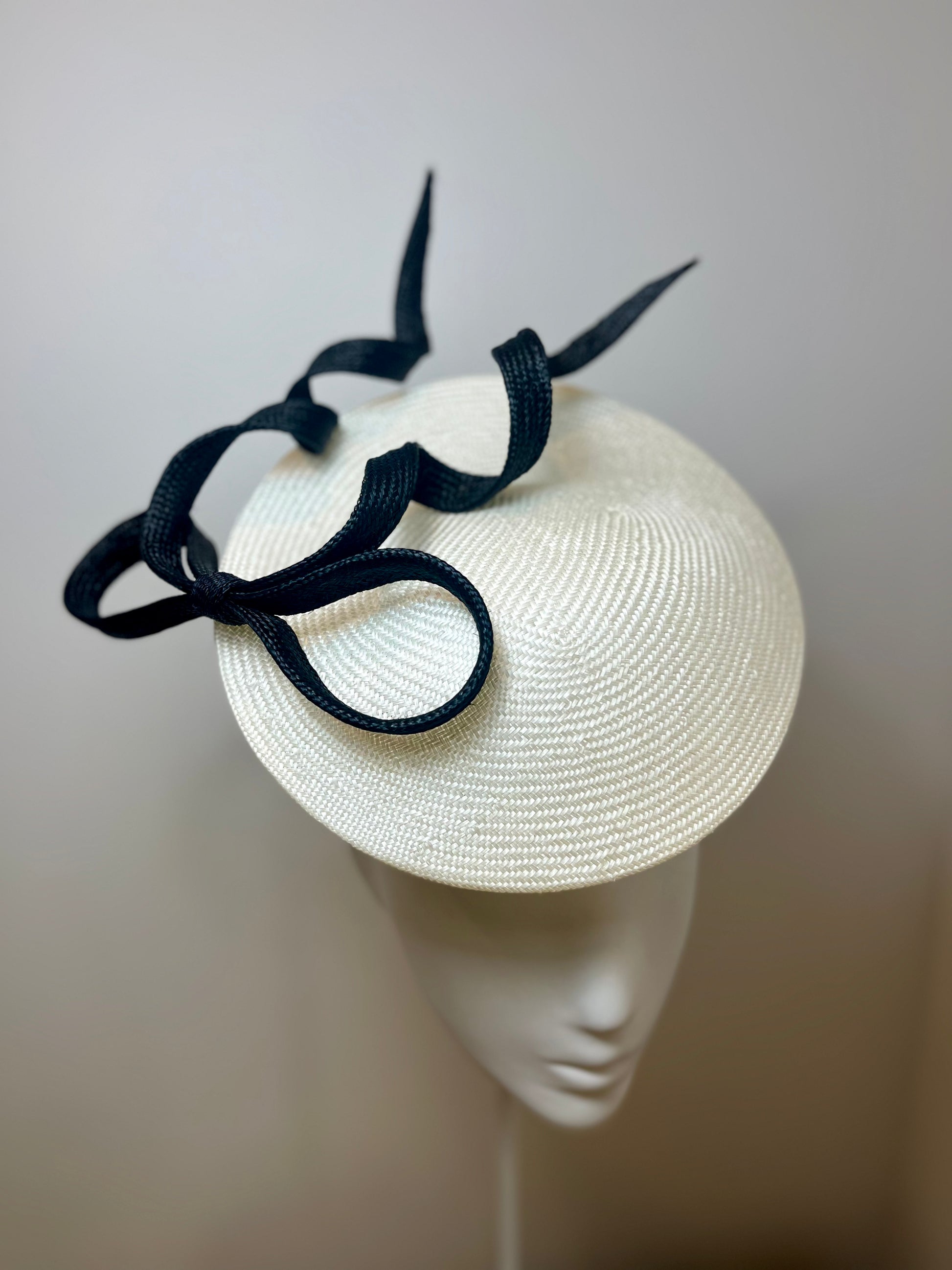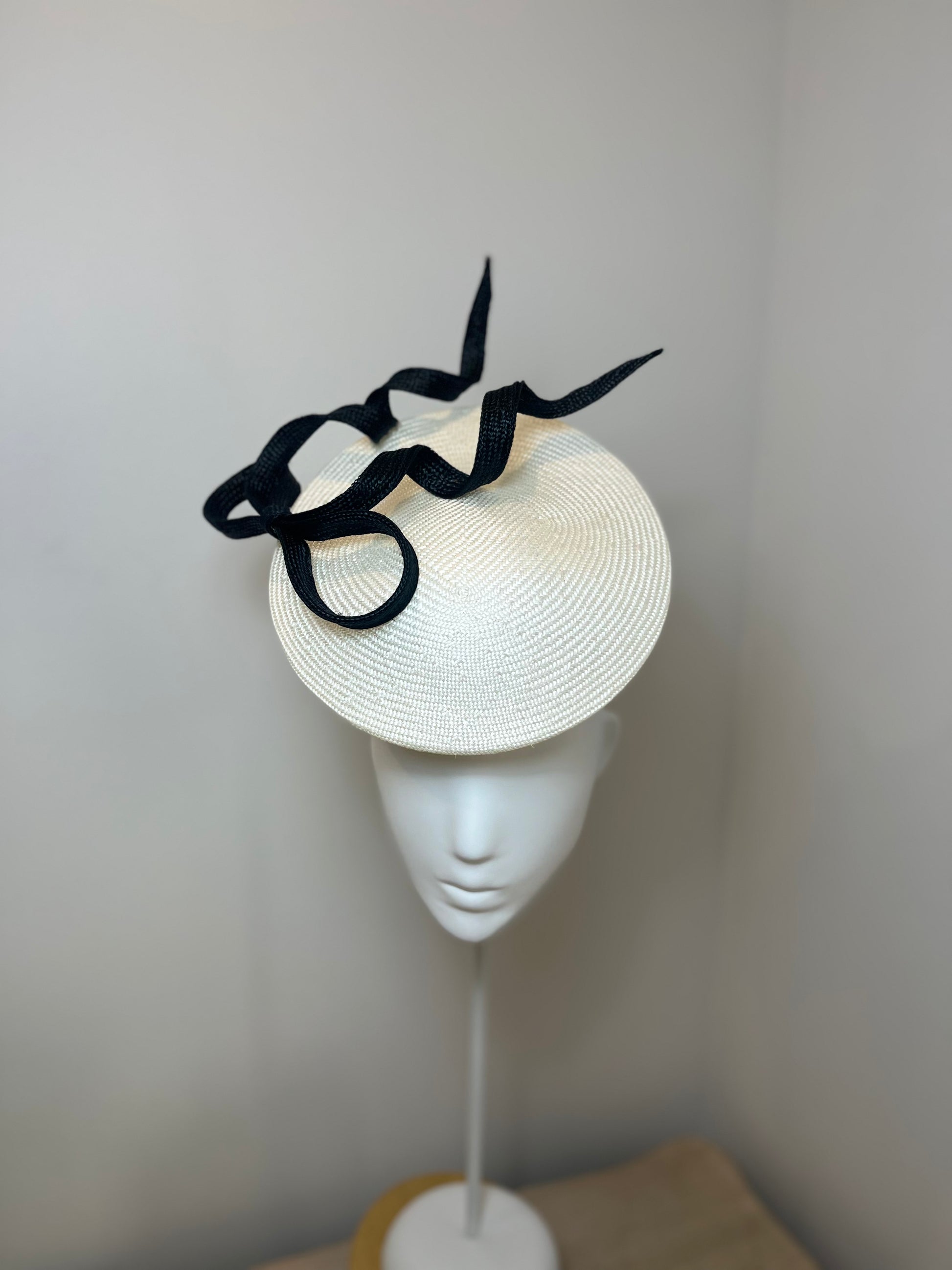 This striking fascinator combines classic sophistication with modern artistry. Crafted from ivory parisisal straw, its sleek round base sits gracefully atop the head, offering a polished canvas for dramatic embellishment. Bold black sculptural loops rise and curl with dynamic movement, creating an eye-catching silhouette that exudes both elegance and confidence. Perfect for weddings, races, or high-society events, this headpiece makes a statement of refined glamour. Lightweight and comfortable to wear, it’s designed to complete your outfit with a touch of avant-garde charm.